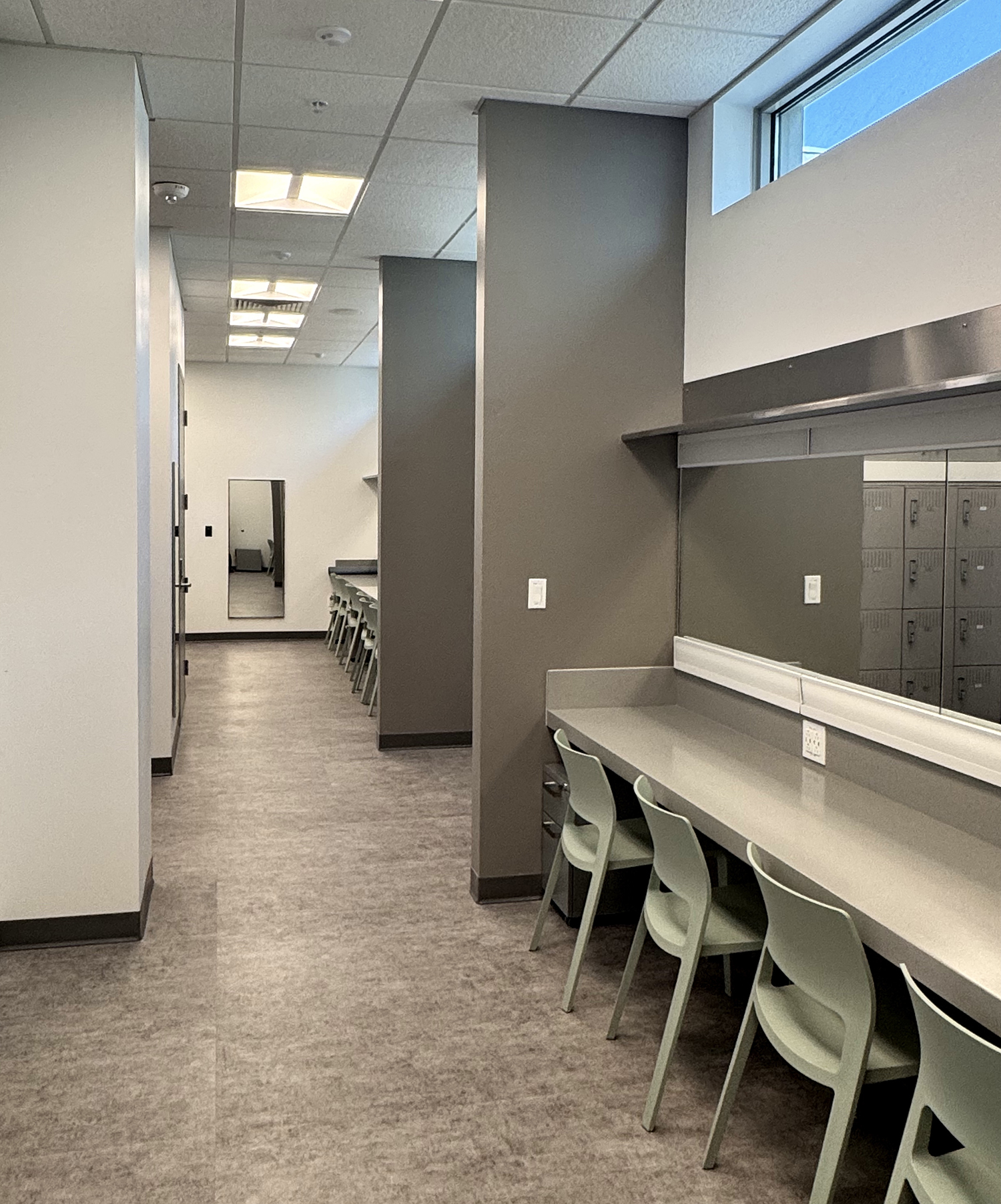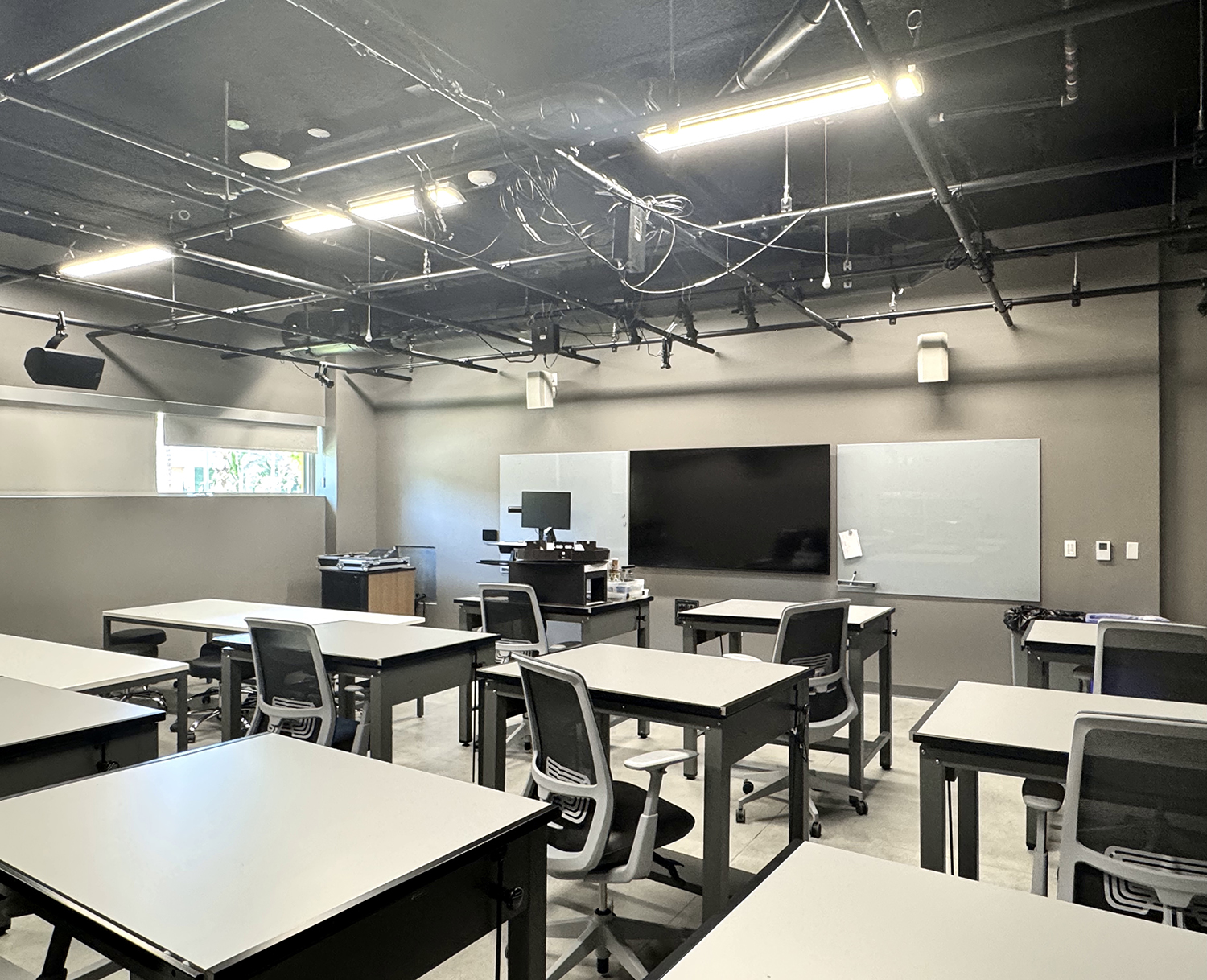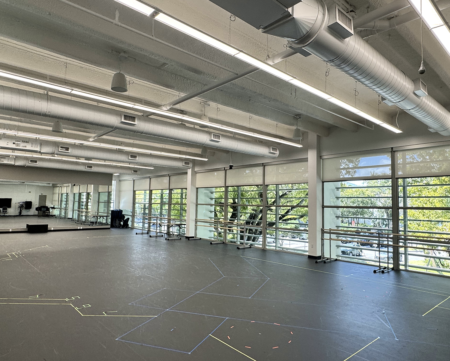 The new Theatre Arts Building celebrates the historic Pentland Building neighbor by placing the signature part of the building program (The Black Box Theatre) at the west end of the axial orientation of the historic structure, acting as an anchor to the new dialogue between old and new.